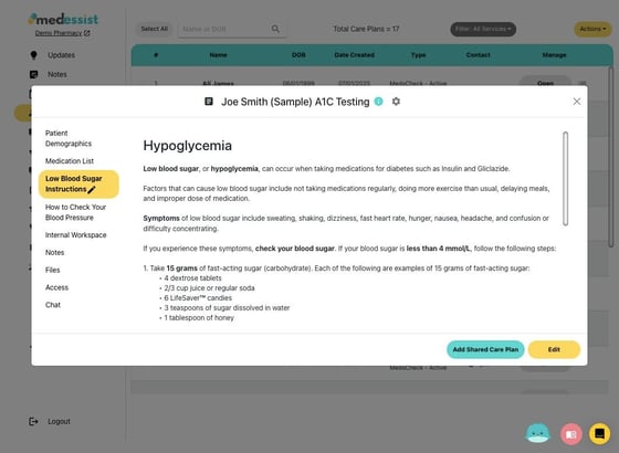 10. Here you can see a shared care plan for "Low Blood Sugar Instructions"