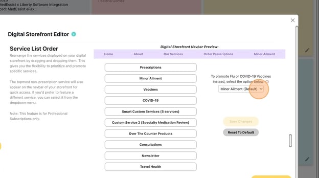 - Scroll down to 'Service List Order' and select the desired service to be displayed on your digital storefront menu bar