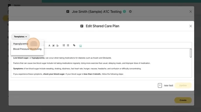 2. Create Your Own or Use a Template: Choose from existing templates (e.g., Low Blood Sugar Instructions) or build a custom care plan.