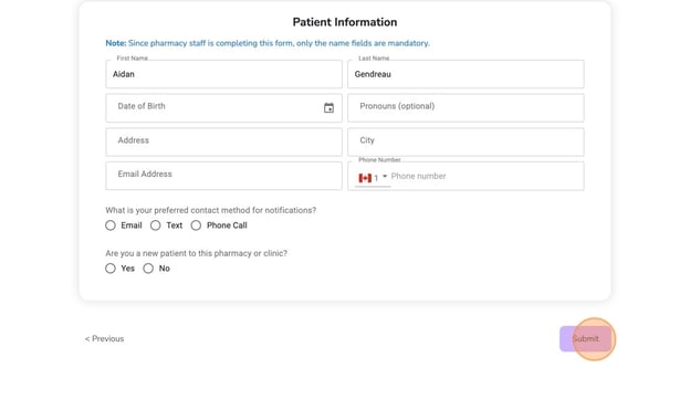 - Complete the entire form, enter the patient's information (only name is required), then click "Submit"
