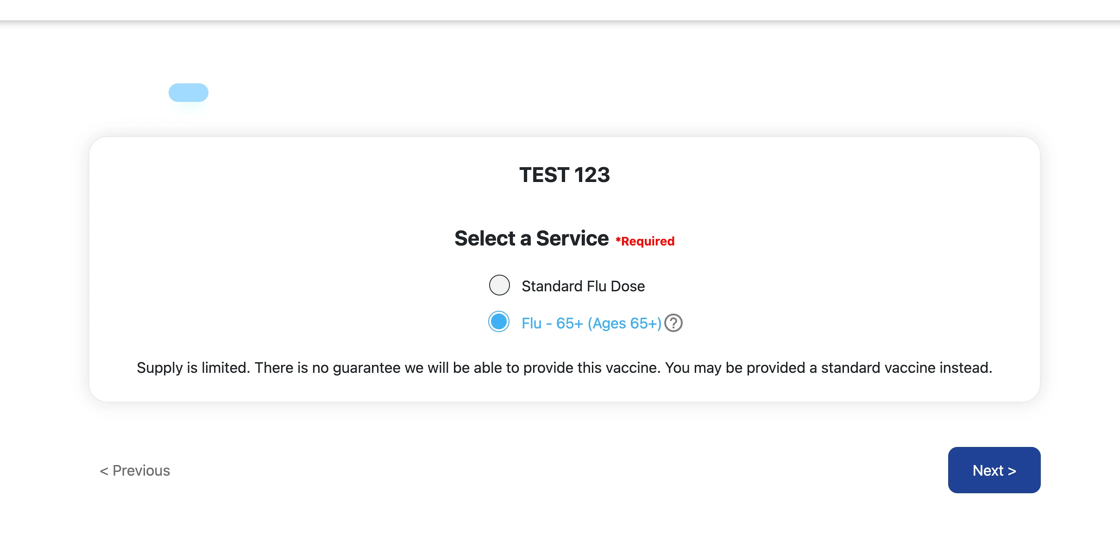 Tip: Tip! Our smart intake forms detect if a patient is over 65 (based on their date of birth) and will automatically ask for flu vaccine preference (regular or high dose)