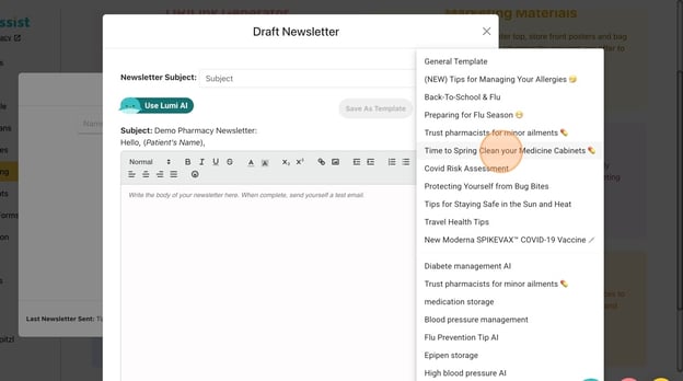- Draft your newsletter or select one of the saved templates from the dropdown menu