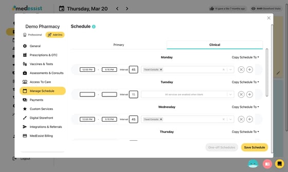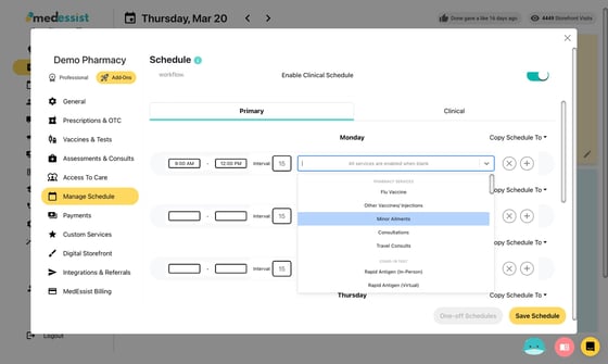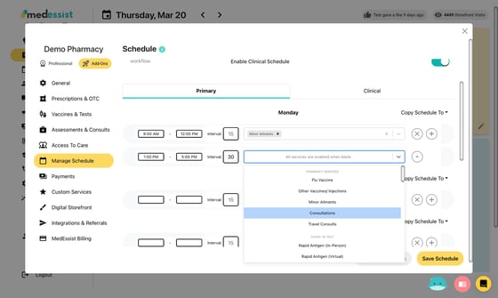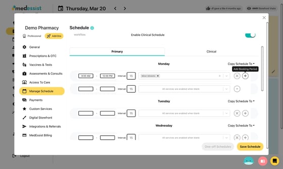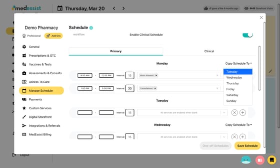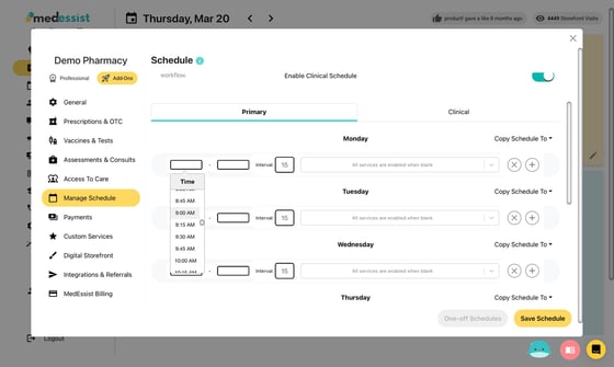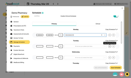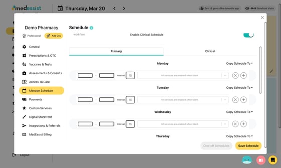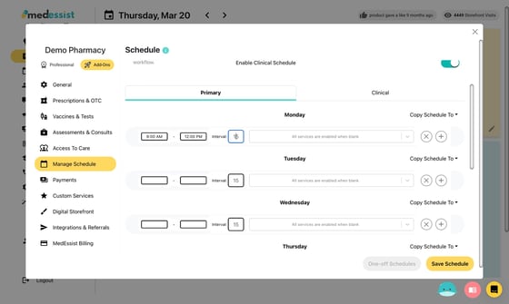 Create and update your primary and clinical schedule to choose when patients are able to book select services. There are nearly endless possibilities to match your unique workflow!