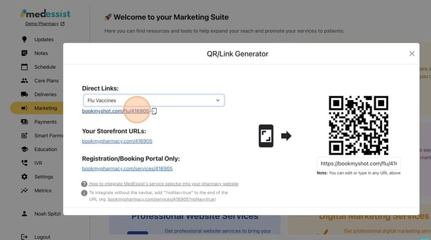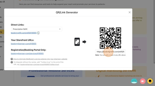 Tip! Direct links to different sections of your Digital Storefront can also be generated from this page. - Select the service you want from the drop-down menu